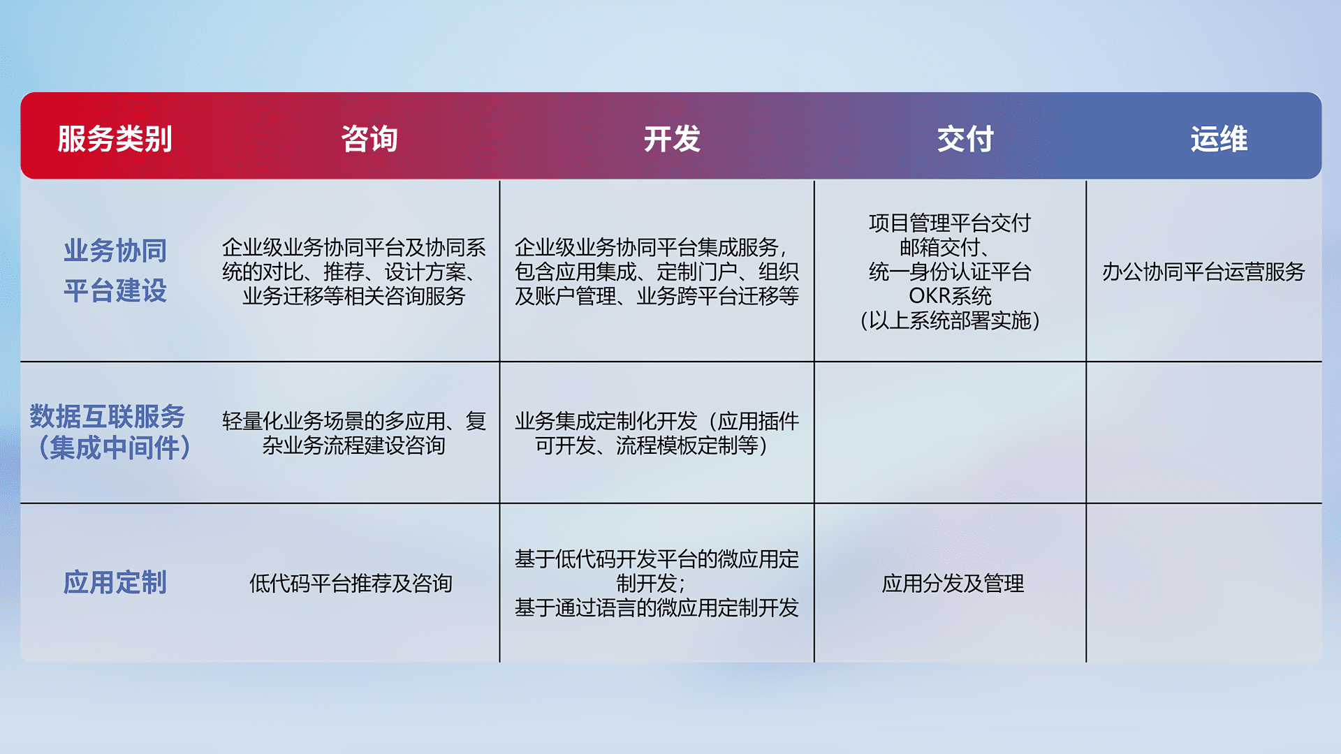 针对钉钉、、企微、、、IDaas等平台级产品提供产品的规划、、方案、、、、交付、、、定制化开发等服务,,,,实现如统一协同办公、、、智能客户服务、、、混合会议管理、、、智能数据查询、、等业务场景,,实现数字化转型。。
