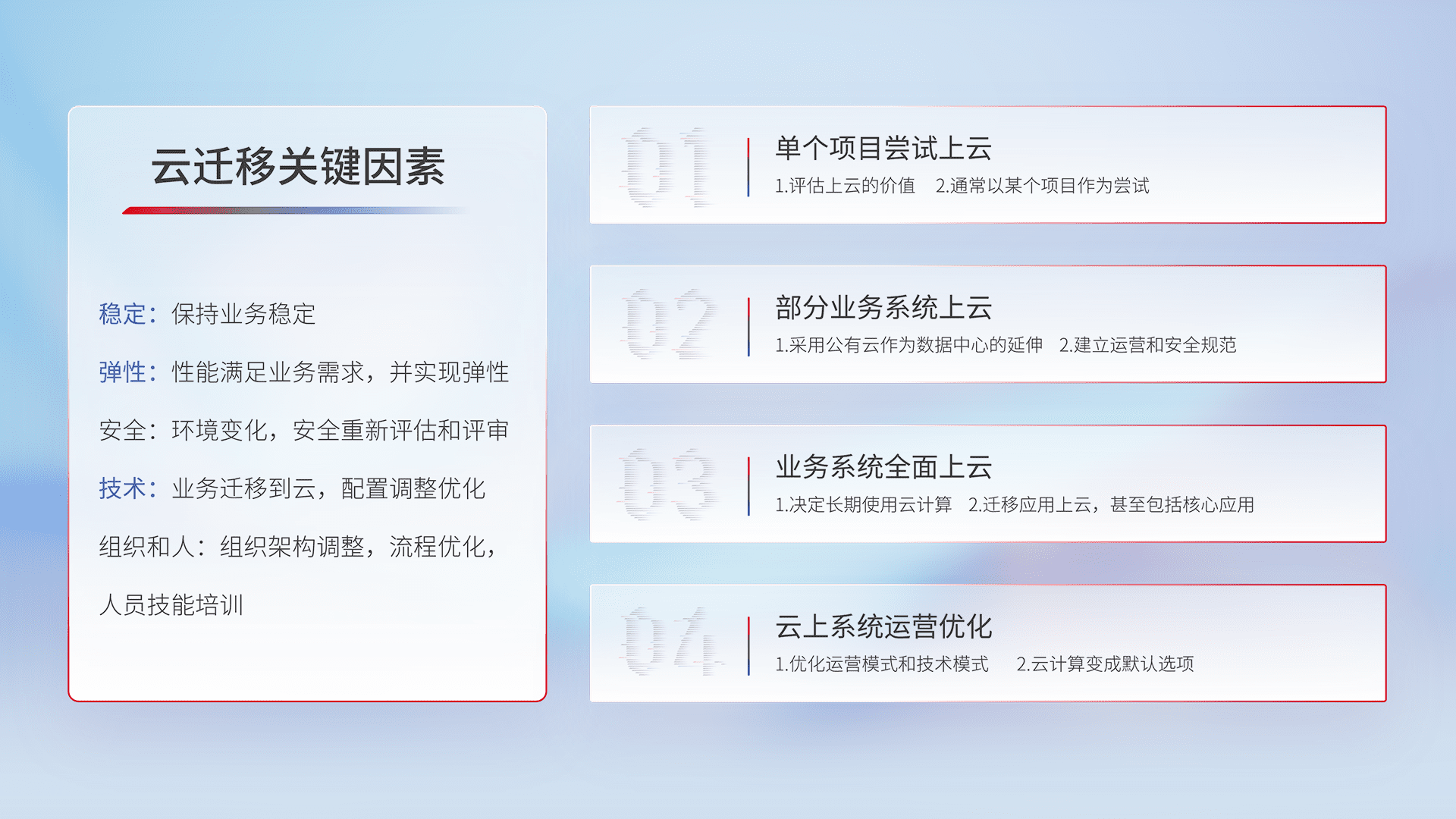 结合实际业务,,,从规划设计、、、云平台选型、、云原生改造、、、数据迁移、、、、集成交付,,,,迁移全过程为客户识别最佳上云路径,,做好风险识别管理,,,设计网络架构、、、、身份权限、、、安全审计合规、、、操作审计、、、、日志审计、、、、监控告警策略、、多站点容灾设计等,,对云上基础设施进行整体规划,,,,提升IT治理水平,,,,以满足弹性、、高可用、、、、高性能的需求。。。。